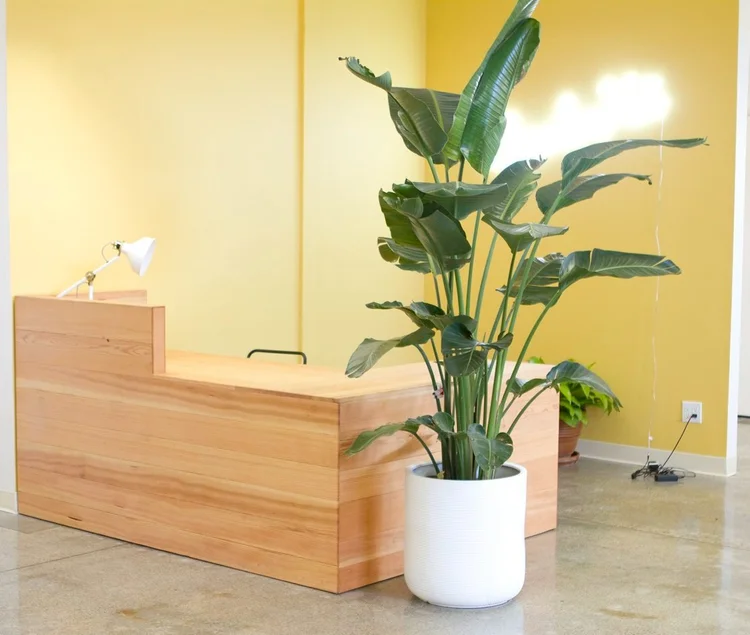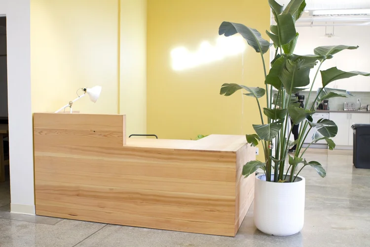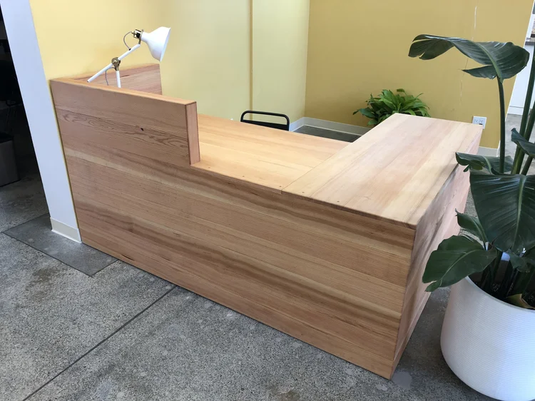 The Backerkit headquarters in San Francisco’s design district is an interior designers dream. The huge open space had tons of natural light and was a blank canvas for Hannah Ruskin. Her team came up with great designs for multiple statement pieces, including this reception desk. The warmth of the douglas fir plays perfectly off of the contrasting concrete floors and creates an inviting environment.