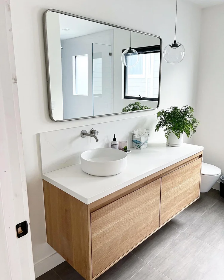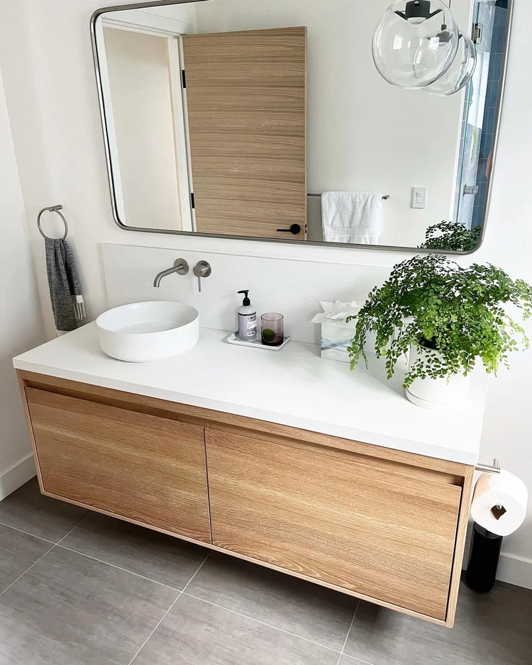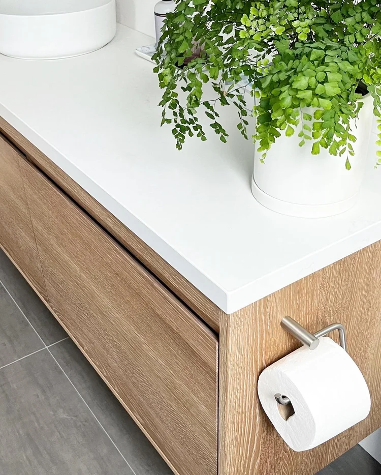 Seamlessly blending form and function, this custom floating bathroom vanity transforms a challenging plumbing requirement into an elegant storage solution. Masterfully crafted from premium rift sawn white oak, the vanity features meticulously grain-matched drawer fronts that create a continuous, flowing aesthetic. Two soft-closing undermount drawers provide smooth, whisper-quiet operation, with an ingeniously designed U-shaped left drawer that gracefully accommodates plumbing while maximizing storage space. This floating design adds a contemporary touch while creating an airy, spacious feel in your bathroom