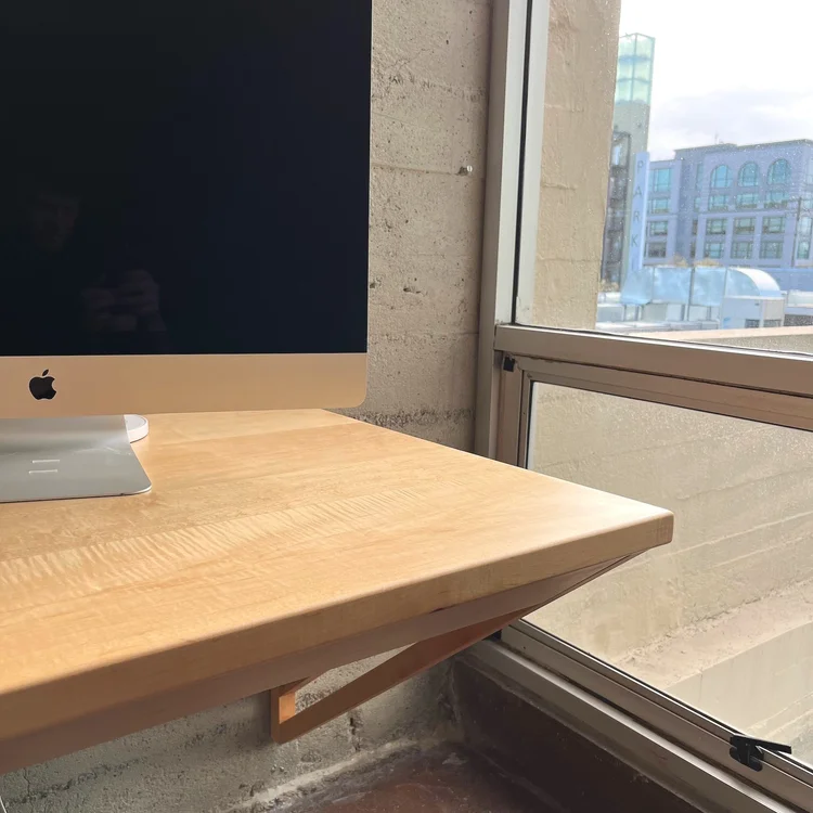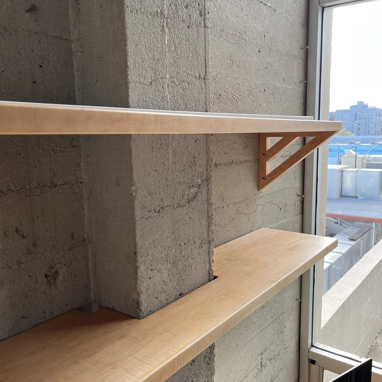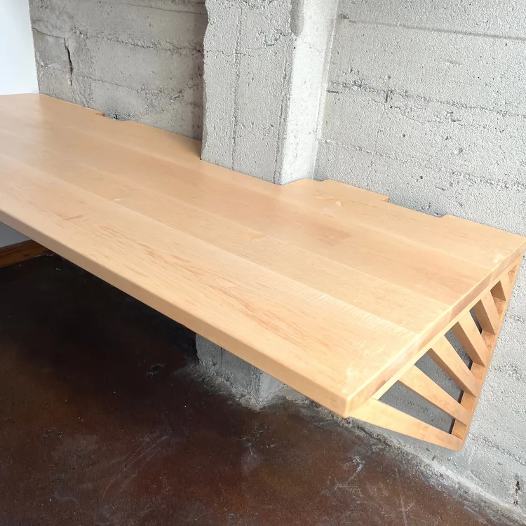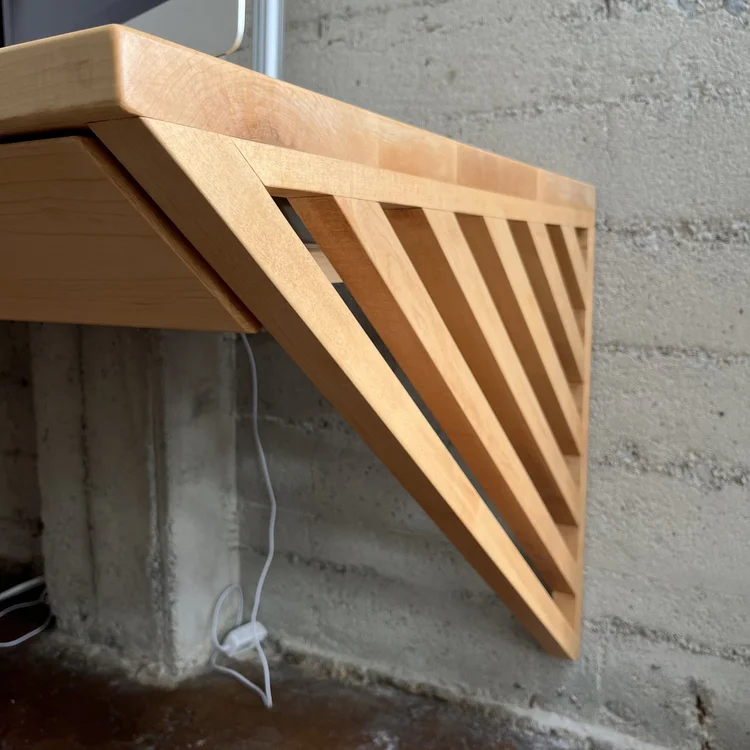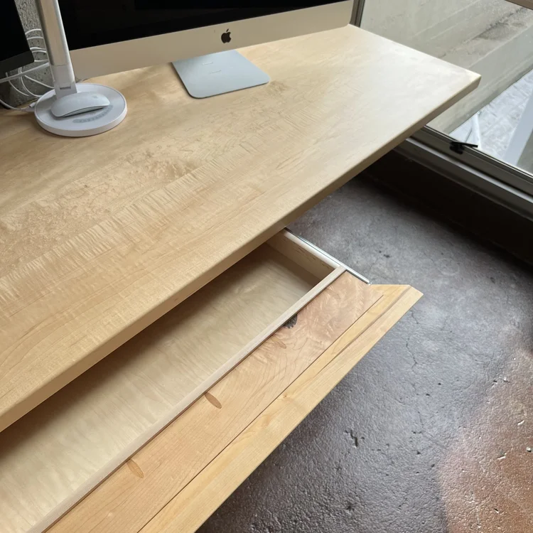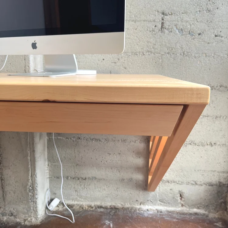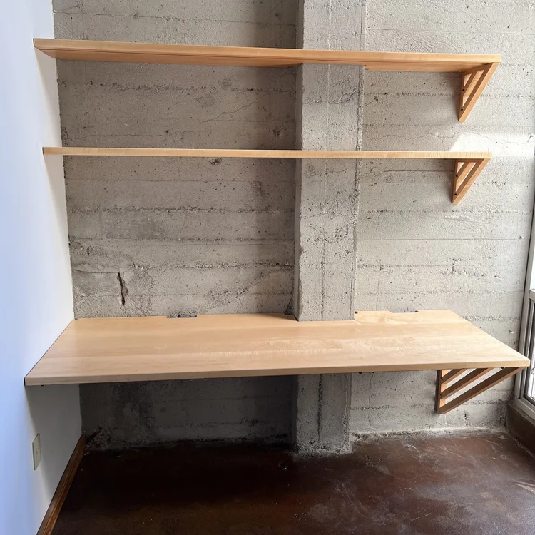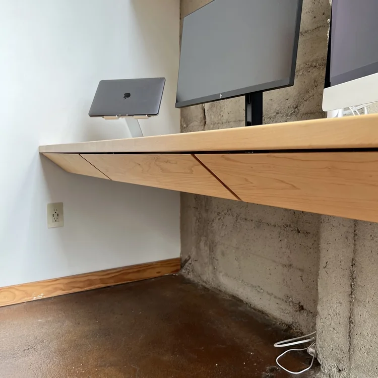 This industrial artist loft in Oakland needed a dedicated workspace for our client who runs a business from home. The concrete walls have a distinct character that provided the perfect backdrop for contrasting warm tones of this solid maple desk and shelves. The angled gusset provides extra support and an interesting aesthetic. Top-mounted drawers have drawer faces that match the angle of the gusset, providing a sleek and unencumbered storage solution.