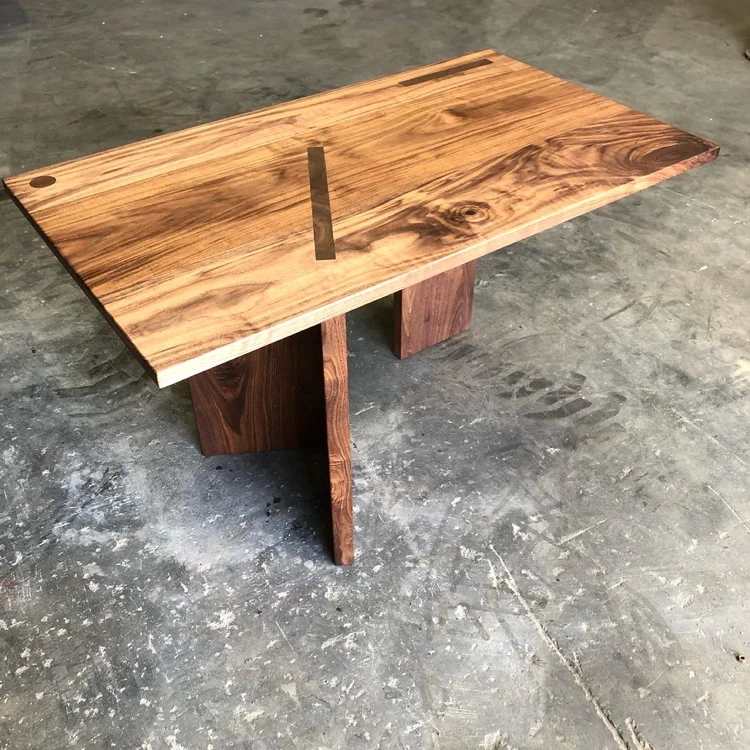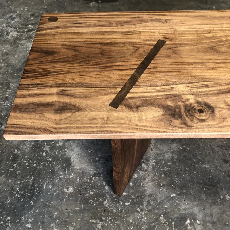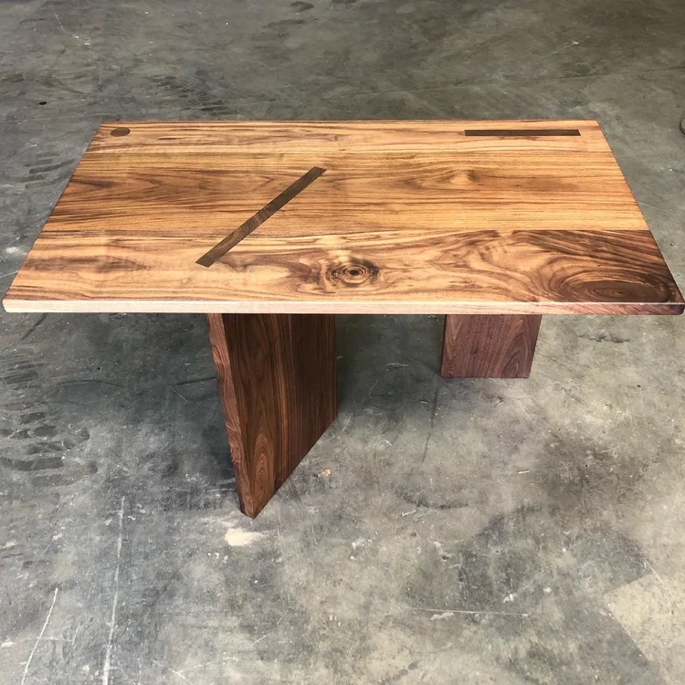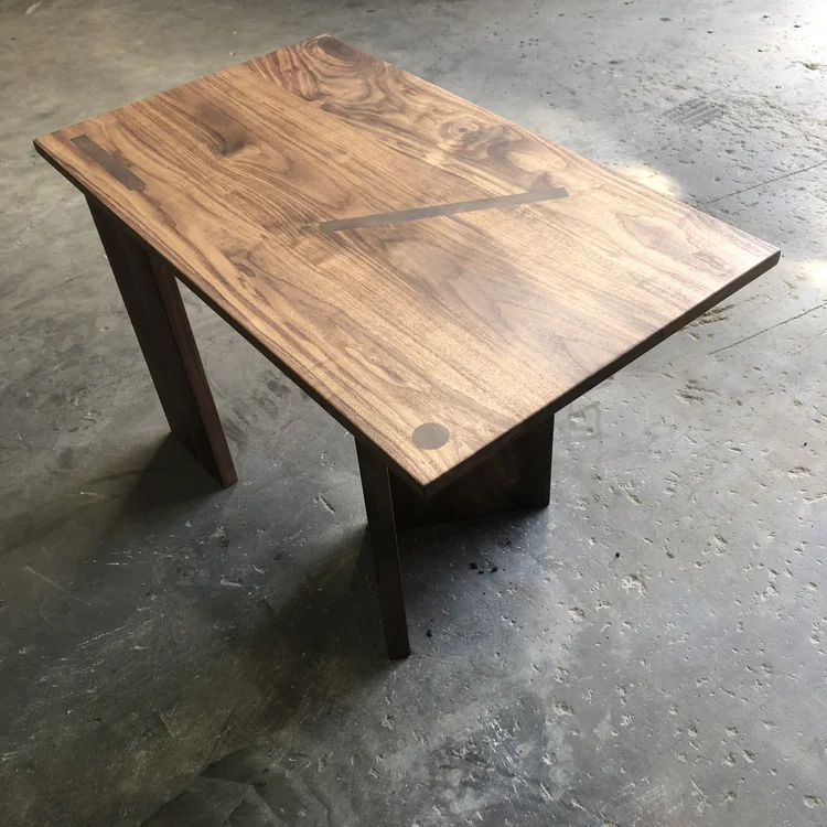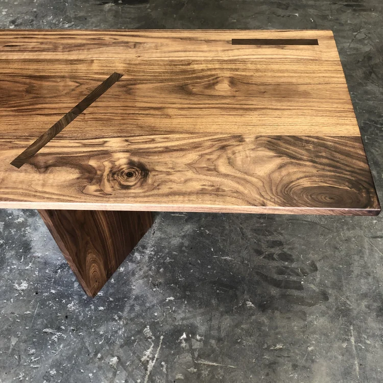 This solid walnut table highlights stunning through-mortise joinery. The end grain patterns of the base come directly through the surface of the table to create a dynamic geometric pattern that is eye catching and an impressive display of craftsmanship.