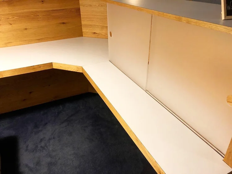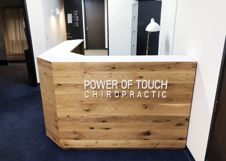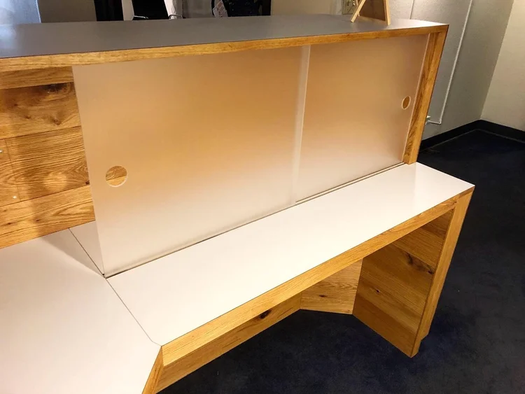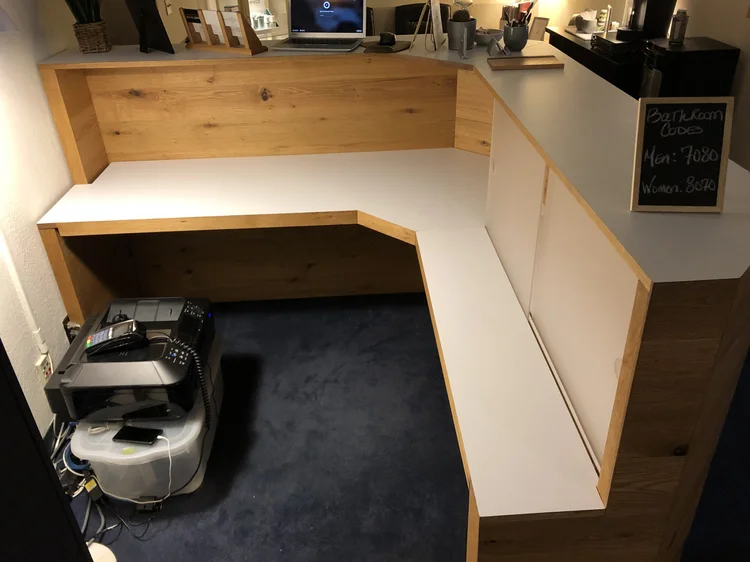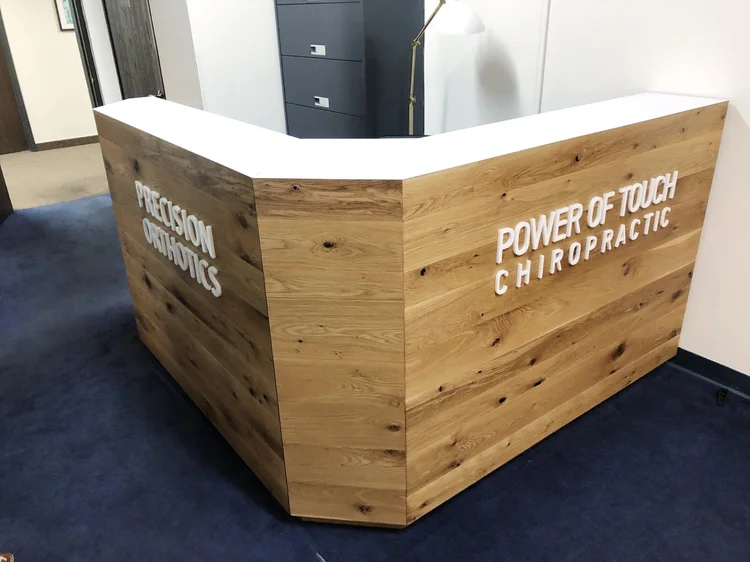 Designed to balance professionalism with comfort, this reception desk combines sleek white laminate with the organic warmth of rustic white oak. The durable, easy-to-maintain laminate surface ensures a pristine work environment, while the natural character of the white oak adds an inviting element that helps put patients at ease. This harmonious blend of materials creates the perfect welcome point for a healing space, marrying practical functionality with a calming aesthetic that sets the tone for the entire office
