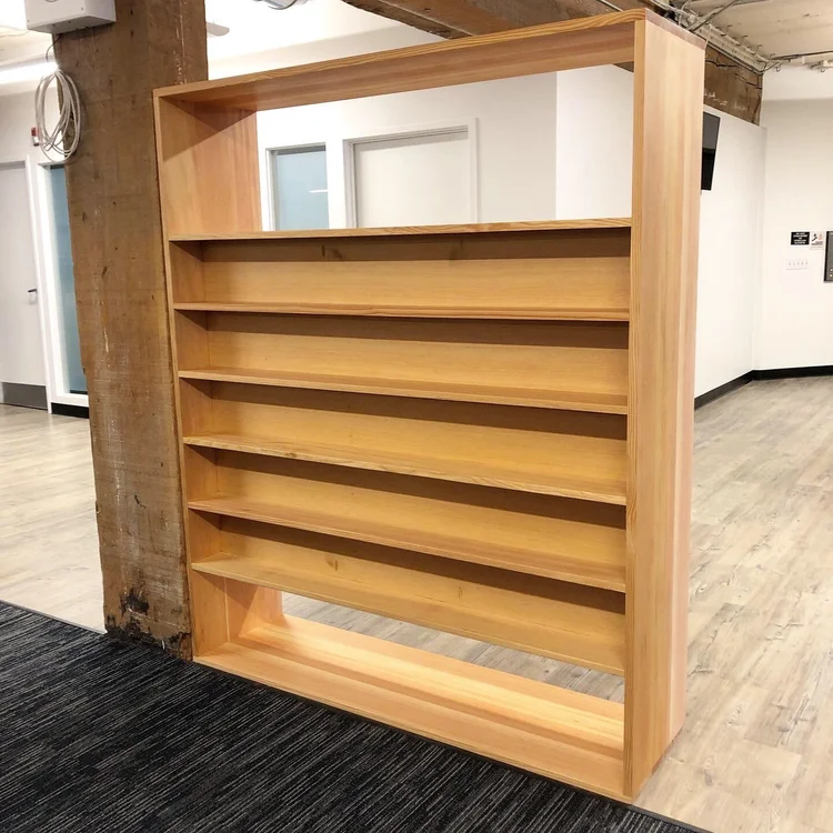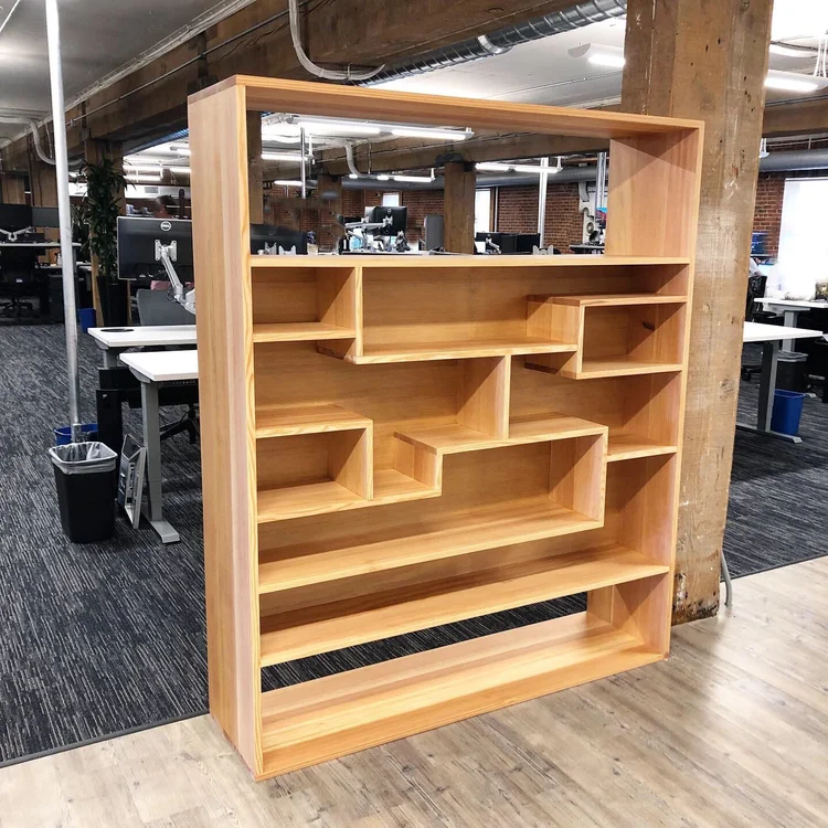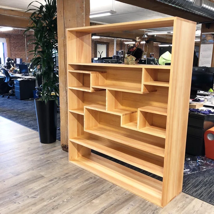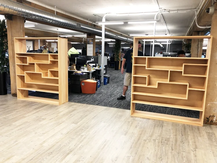 Custom-designed for Ubisoft’s San Francisco headquarters, these freestanding display partitions elegantly solve multiple design challenges in their open-concept office. The dual-sided units feature patterned display fronts that showcase character models from their video game portfolio, while the reverse side houses a comprehensive library of their games. Crafted from select vertical grain douglas fir, the units serve as sophisticated room dividers that maintain an open feel while defining distinct spaces. The clean lines and precise detailing of these display shelves reflect both their premium materials and the creative spirit of the gaming industry they serve.